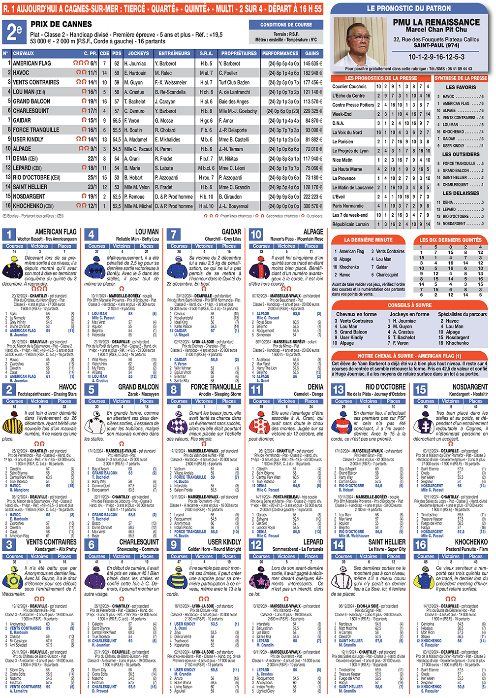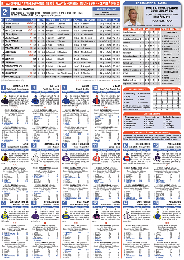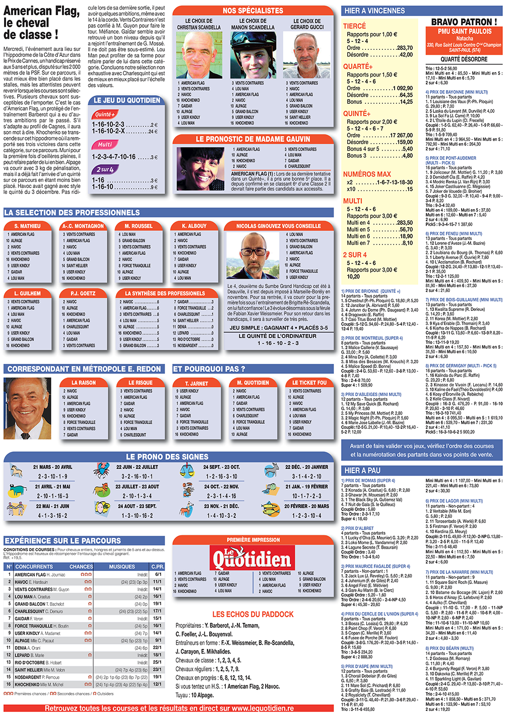• Des études poussées sur le quinté du jour et du lendemain : tendances, partants, statistiques, sélection, coup de cœur, choix de la presse…