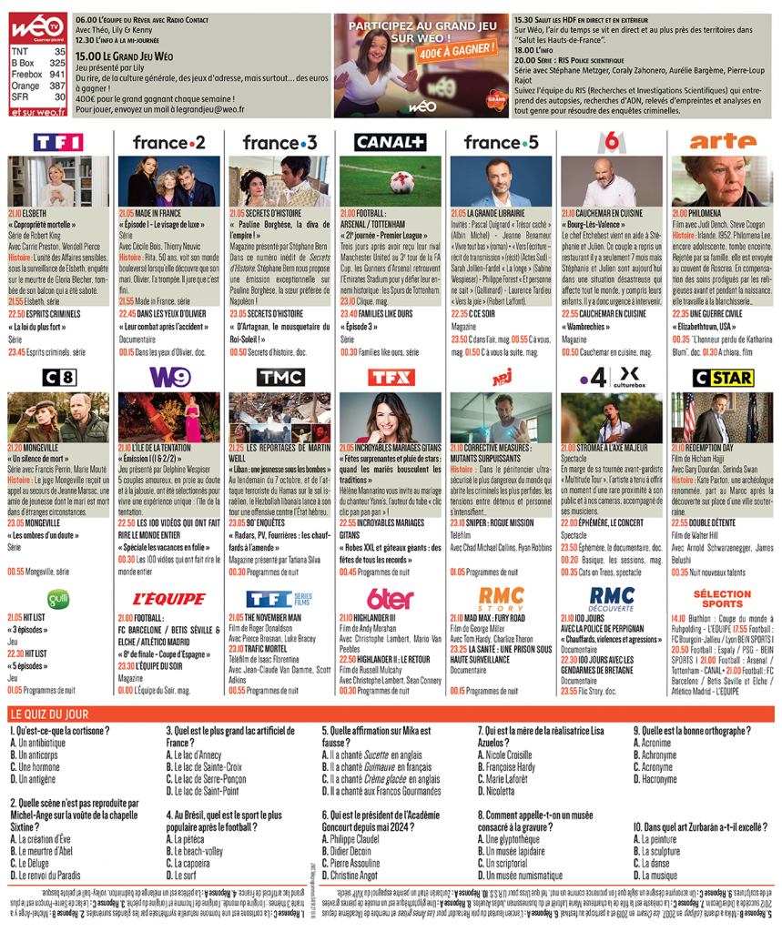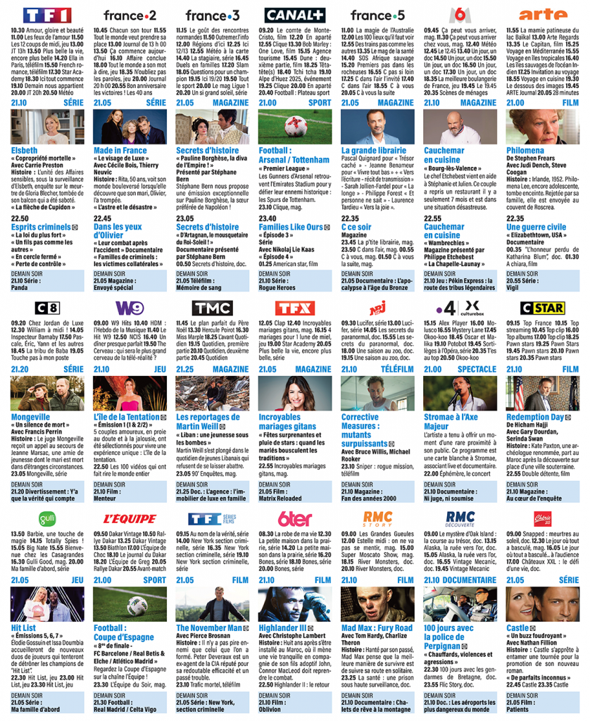 Programme TV Un programme clair et précis Un programme issu des chaînes et mis à jour en temps réelPlus de 100 chaînes disponibles sur plus de 15 jours de profondeurIntégration de chaînes ultra-locales sur demande pour régionaliser la page contactez-nous
